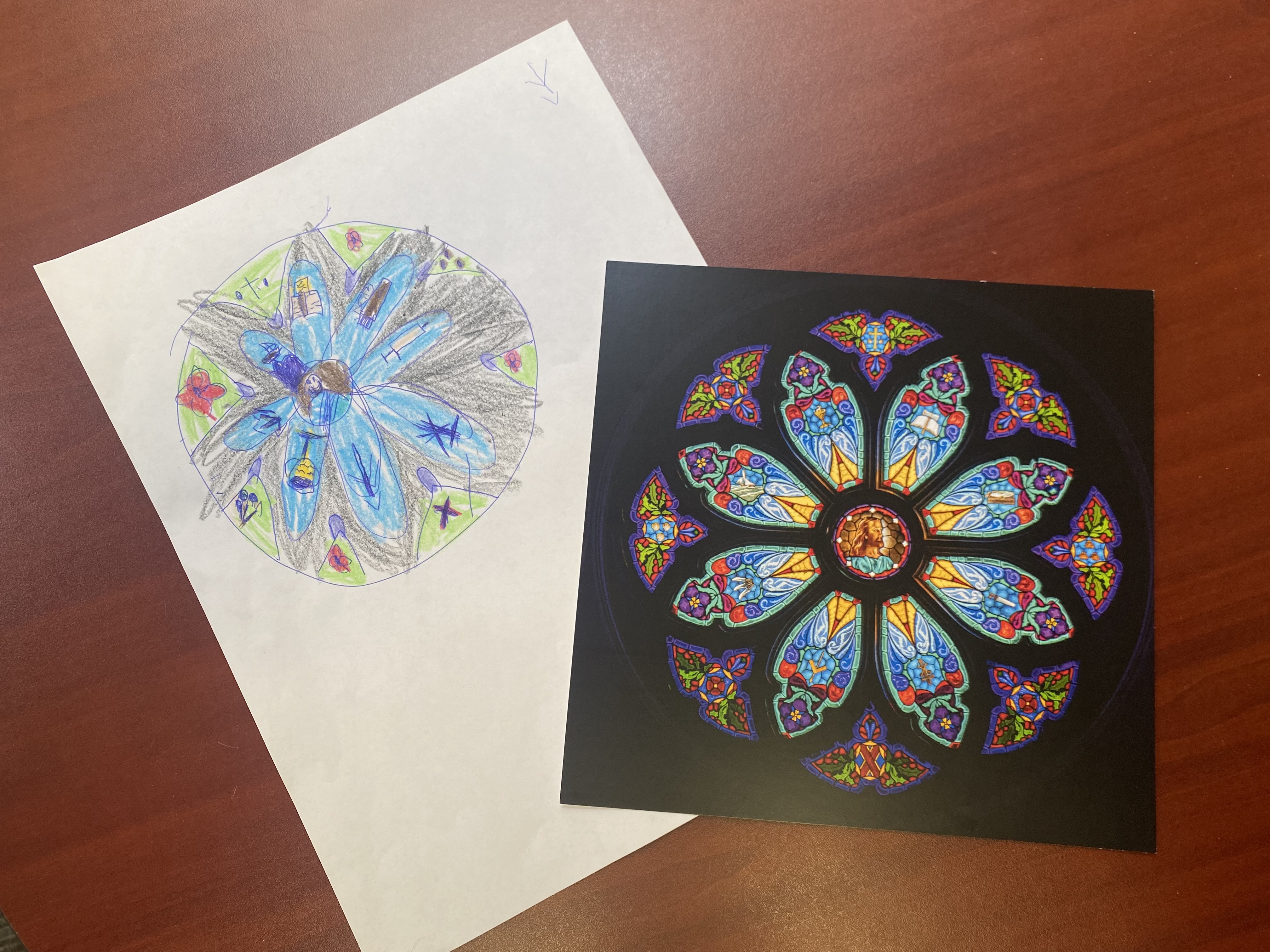 An unidentified artist left behind a beautiful depiction of our window. It includes detailed sketches of the various images, which represent the 12 disciples, contained in the rose petals and outer edges of the window. These subtle details often go unnoticed by most adults.