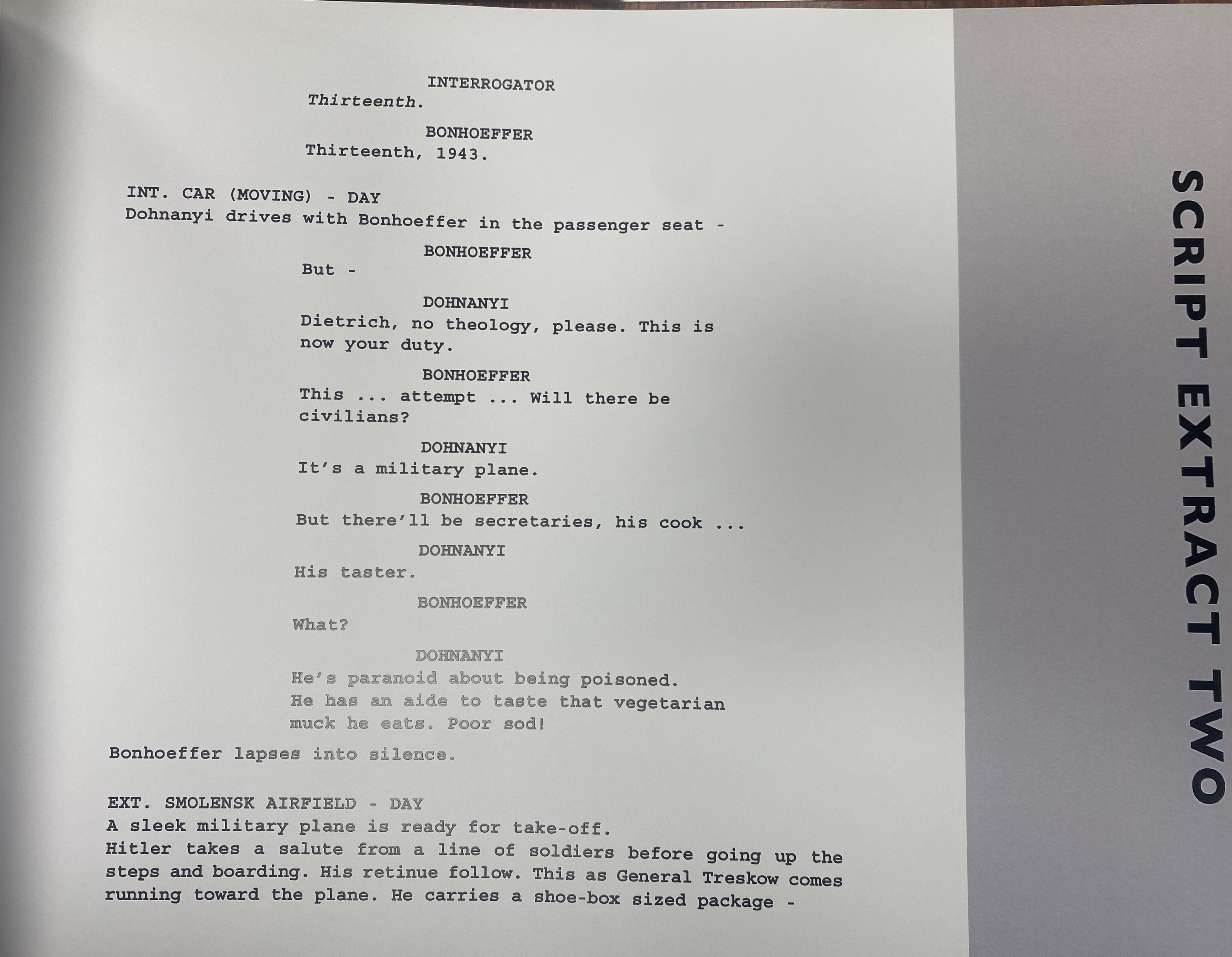 Denise Hurley gifted me this gem (the second time she appears on this log!). It appears to be a book used for the purpose of soliciting funds for a film titled “I Am Dietrich Bonhoeffer.” My feeble attempts to google more information has yet to yield much information. The book is fascinating. It is oversized and filled with a synopsis of Bonhoeffer’s life, script extracts, film locations, story boards, and more.